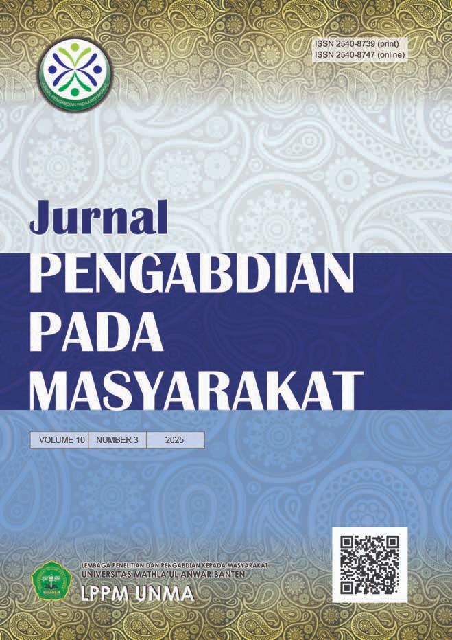 Jurnal Pengabdian Pada Masyarakat (JPPM), with registered number ISSN 2540-8739 (print), ISSN 2540-8747 (online) is a scientific multidisciplinary journal published by LPPM of Universitas Mathla’ul Anwar (Unma) Banten. It is in the national level that covers a lot of common problems or issues related to community services. The aim of this journal publication is to disseminate the conceptual thoughts or ideas and research results that have been achieved in the area of community services. We proudly announce that Jurnal Pengabdian Pada Masyarakat (JPPM) is accredited “Rank 4” (Peringkat Sinta 4) as a scientific journal under the decree of the Ministry of Research, Technology and Higher Education of the Republic of Indonesia, Decree No. 158/E/KPT/2021, which is valid for five years since enacted on November 2025.